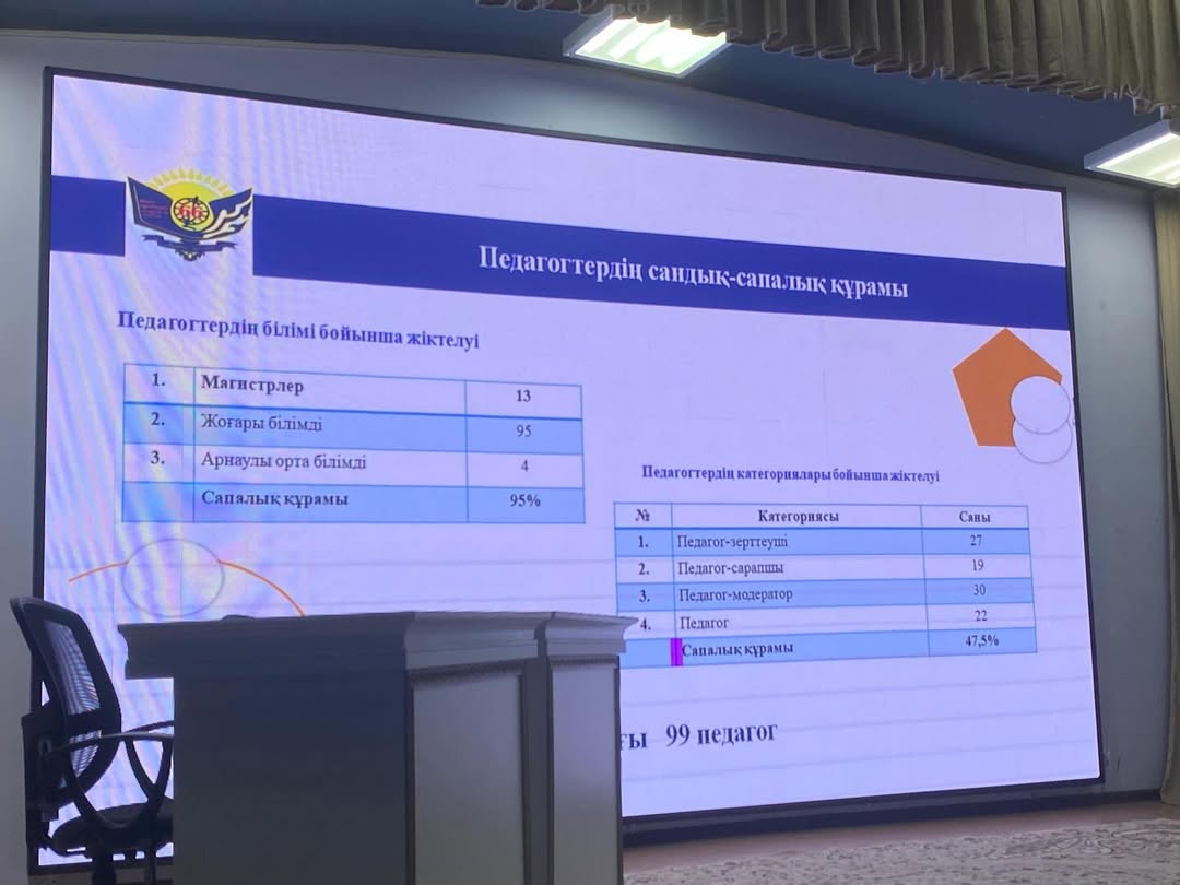 Педагогтердің сапалық құрамы – біліктілік арттыру, аттестаттаудан өту, кадрлардың кәсіби әлеуеті туралы мәлімет берілді.